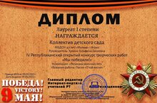 Коллектив детского сада принял участие в IV Республиканском открытом конкурсе творческий работ "Мы победили" с песней "О той весне" и стали лауреатом 1 степени