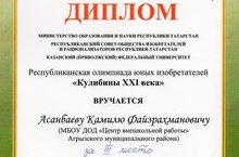 28 апреля 2015 года на базе IT лицея Казанского федерального университета состоялся Финал VIII Республиканской олимпиады юных изобретателей «Кулибины 21 века». На очном этапе олимпиады принял участие ученик 7 класса (младшая возрастная группа) Терсинской школы Асанбаев Камиль. За интересное воплощение своих идей в техническое изобретение номинации «Техническое решение – рационализаторские предложения» Камиль награжден дипломом III степени и сертификатом на получение премии в сумме 1000 рублей. Педагог, подготовивший победителя муниципального этапа и призера республиканского этапа олимпиады - Салихов Магсум Салихзянович, учитель технологии Терсинской школы.ПОЗДРАВЛЯЕМ!!!