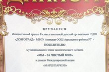 Победителем муниципального этапа экологического десанта «Мы- за чистый мир» в рамках Международной акции «Марш парков» признана Инициативная группа 8 класса школьной детской организации РДШ «ДОБРОГРАД» МБОУ Азевская ООШ