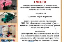 Согласно календарного плана организационно-массовых мероприятий технического направления МБУ ДО ДДТ «Радуга талантов» на 2021-2022 учебный год, на основании приказа ГБУ ДО «РЦВР» №122 в/б от 22.11.2021, положения о республиканском конкурсе на лучшее изделие технического творчества педагогических работников «Творчество в каждом из нас», в целях развития творческой активности и профессионального мастерства педагогических работников образовательных организаций путем поддержки и стимулирования инновационной, научно-технической деятельности, с 22.11.2021 по 12.12.2021 года проходил конкурс «Творчество в каждом из нас», в котором педагог дополнительного образования МБУ ДО ДДТ «Радуга талантов» Гадыршин Айрат Фаритович занял первое место.