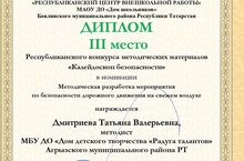 С 11 октября по 10 декабря 2021 года в ГБУ ДО «Республиканском центре внешкольной работы» г.Казань прошел Республиканский конкурс методических материалов «Калейдоскоп безопасности». Педагоги дополнительного образования Нуриева Наталья Васильевна получила грамоту «За творческий подход», Садыкова Алсу Фаритовна свидетельство участника. Методист Дмитриева Татьяна Валерьевна заняла III место в номинации «Методическая разработка мероприятия по безопасности дорожного движения на свежем воздухе». Поздравляем с отличными результатами! Пускай вам всегда сопутствует Синяя птица удачи и приятный аромат победы.