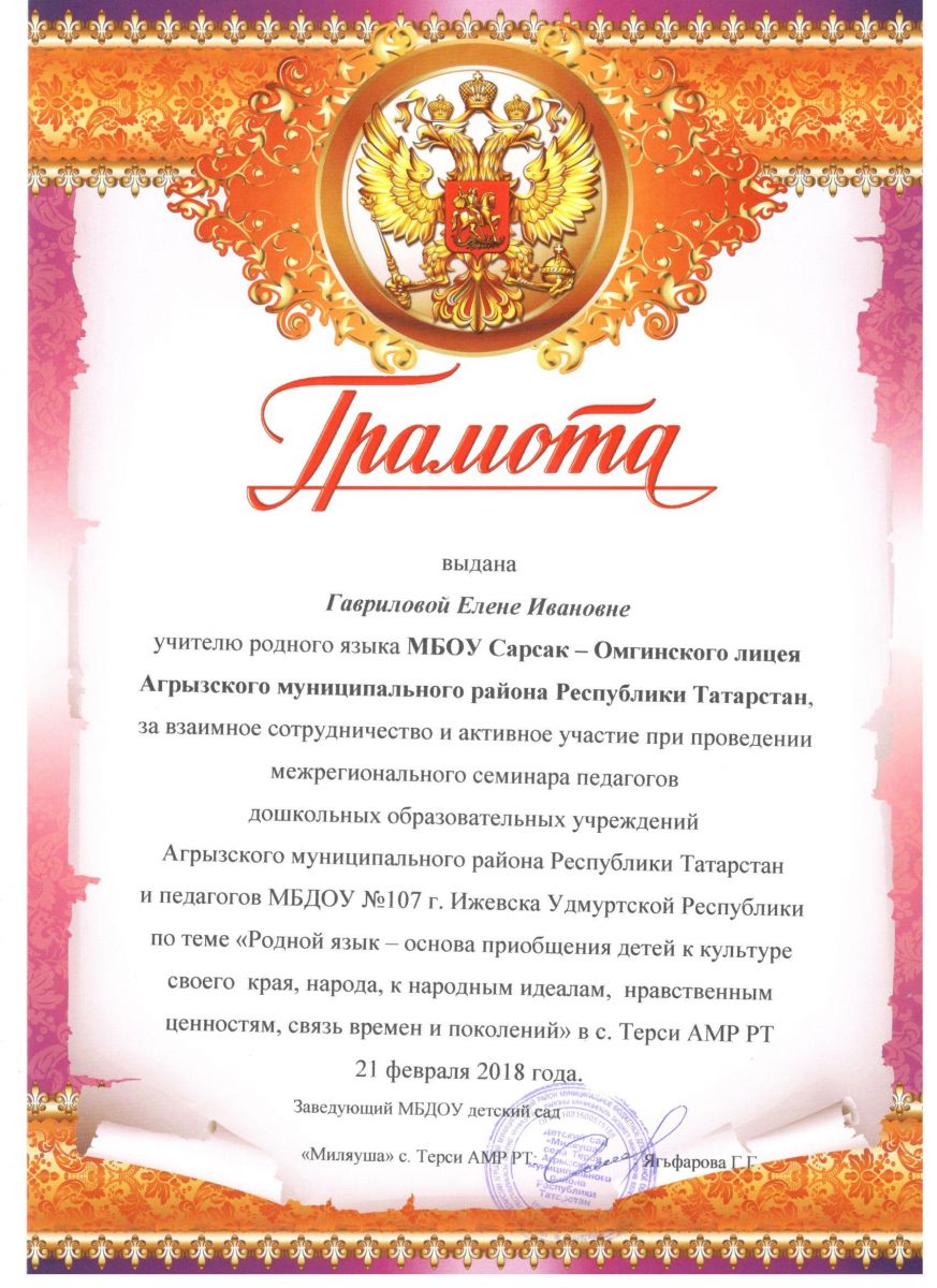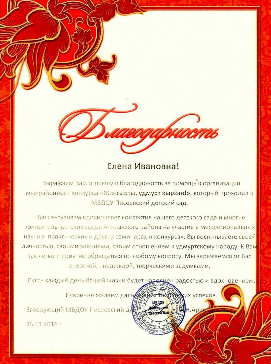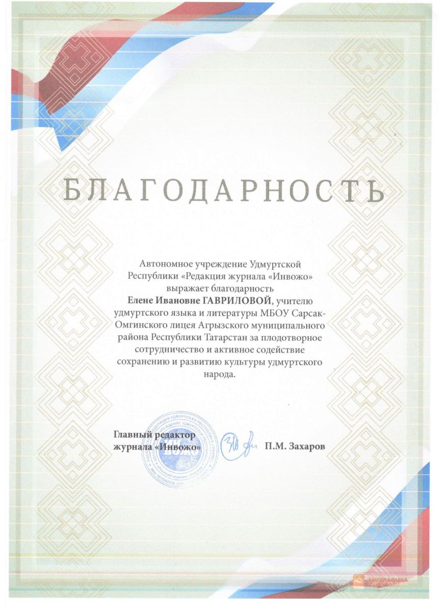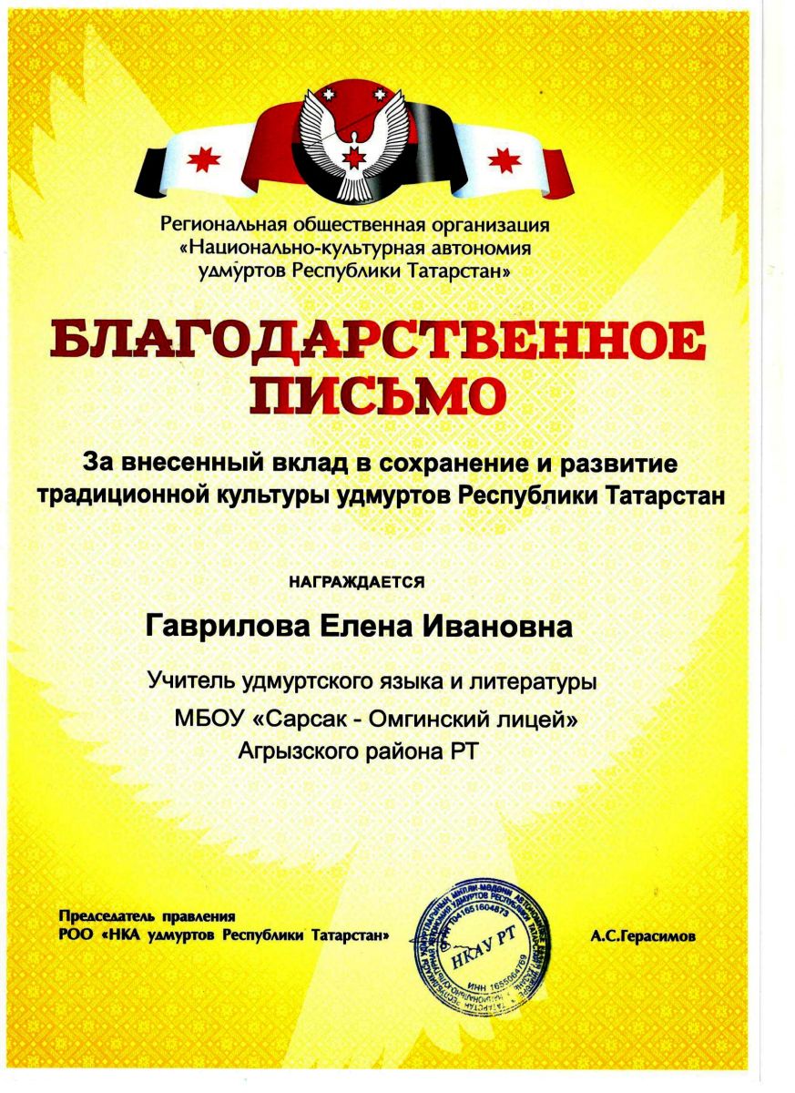 Благодарственное письмо РОО Национально-культурная автономия удмуртов РТ