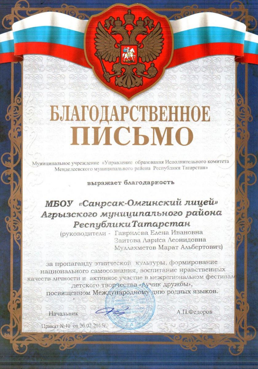 Благодарственное письмо МУ Управление образования ИК Менделеевского мр РТ