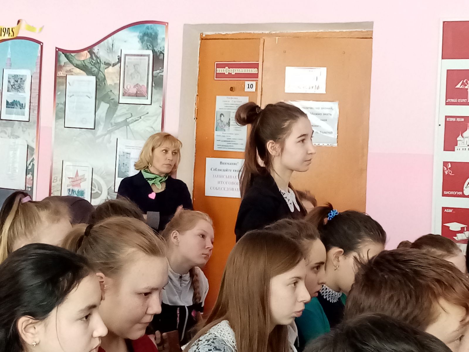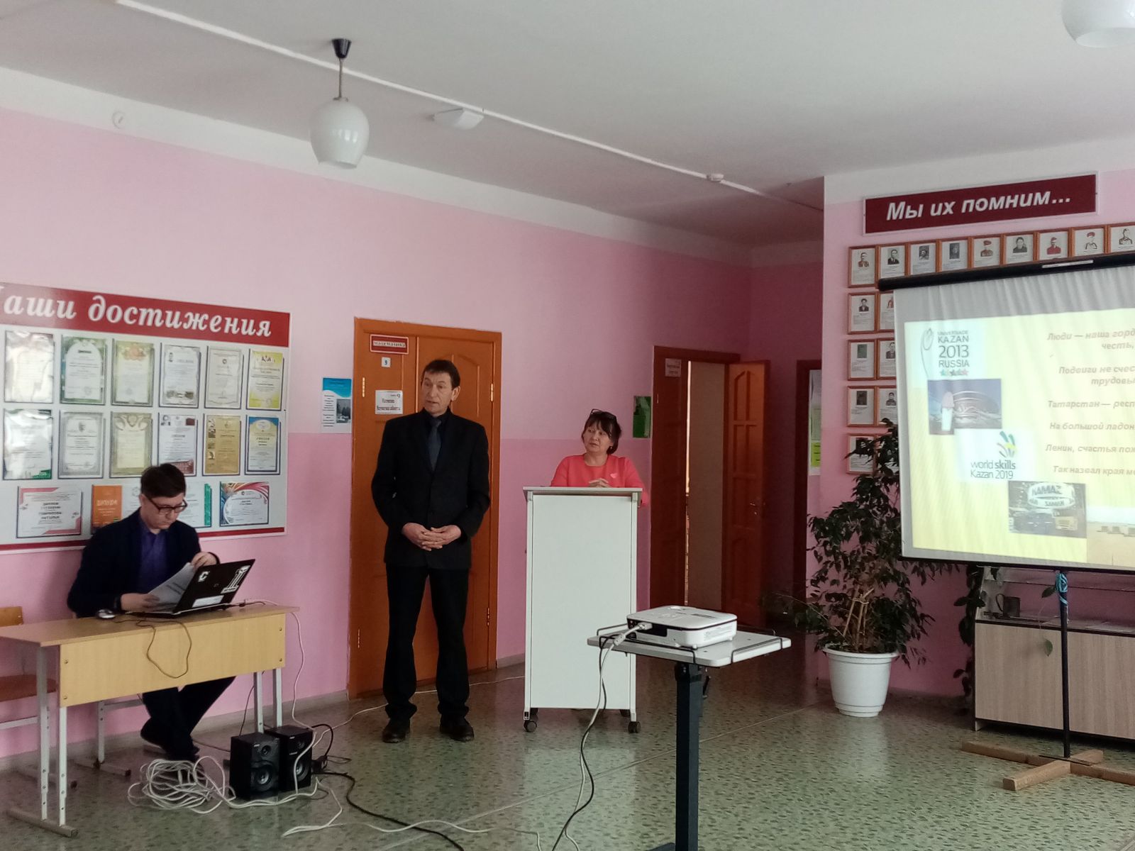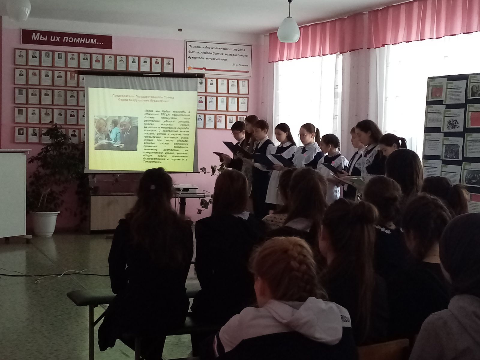 Сегодня целый день в зале Боевой славы шла трансляция документальных фильмов, посвященных 100-летию Татарстана. Кроме этого обучающиеся имели возможность проследить основные вехи развития нашей республики из передвижной выставки, которая расположена в этом же зале. Мероприятие открыла учитель истории и обществознания Тимофеева Раиса Владимировна, ознакомила с целью данного мероприятия. В историческом альманахе обучающиеся 7 класса рассказали о развитии республики Татарстан, о подвиге М. Девятаева, узнали, что в семейном архиве Терентьевой Л. М. хранится фотография М. Девятаева с его семьей. Также ребята рассказали о достойном вкладе в общую победу над врагом жителей Агрызского района, в том числе жителей села Сарсак-Омга. И состоялся показ проектной работы Гордеевой Екатерины "Славные герои села Сарсак-Омга". Савельева Виолетта принесла портрет и рассказала о своем прадедушке Савельеве Николае Ильиче.