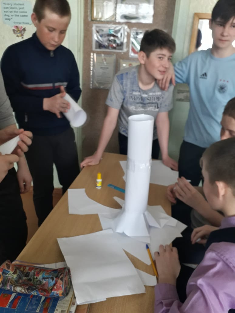6 класс (кл. рук. МаркитоноваТ. В.) - классный час "В космонавты б я пошел..."Всем классом соорудили ракету из бумаги.