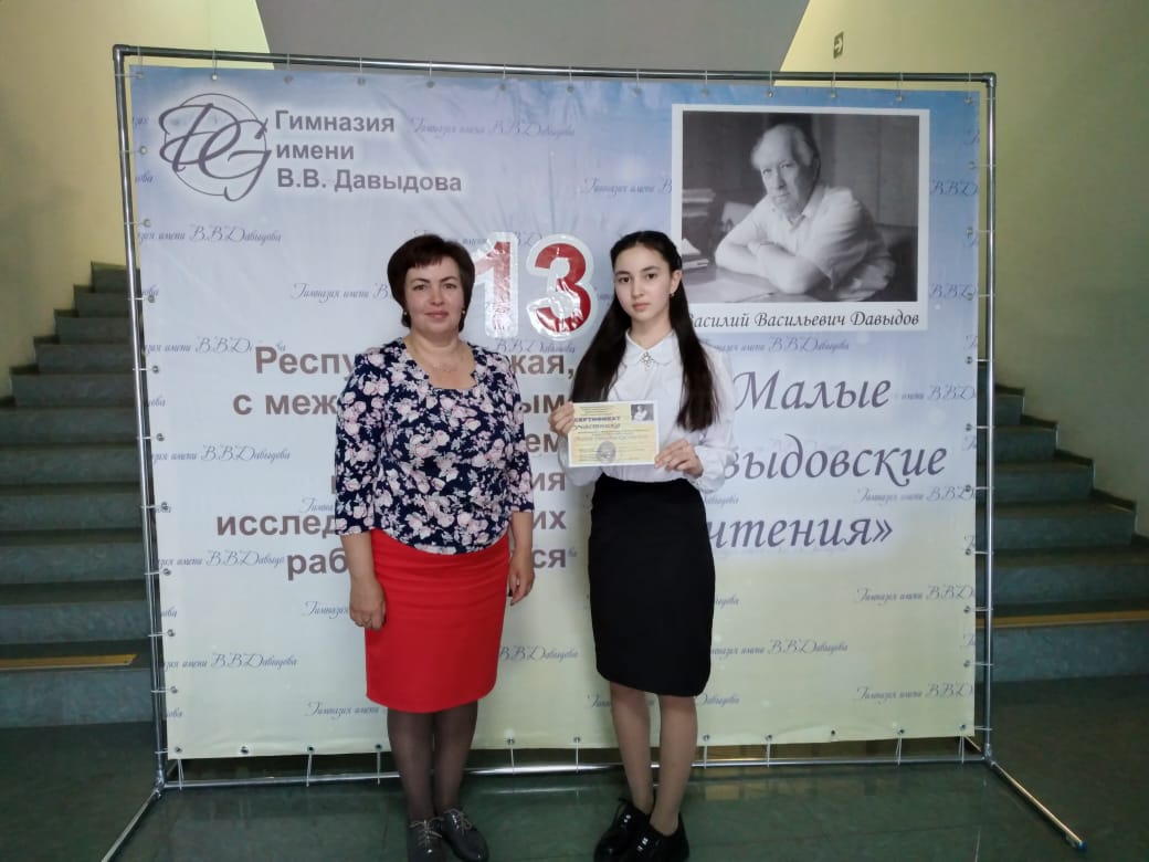 Маркитонова Екатерина (9 сыйныф), Васильева Оксана (9 сыйныф), Шагабиева Гөлназ (10 сыйныф) һәм Хатбуллина Иделия (8 сыйныф) Яр Чаллы Шәһәрендә узган "Кече Давыдов укулары"дип аталган XIII Республика фәнни-тикшеренү эшләре конференциясендә катнаштылар. Барлык катнашучылар да лаеклы чыгыш ясадылар, Маркитонова Екатерина җиңүче булды. Җитәкчеләрне Васильева Галина Алексеевна һәм Шәйдуллина Ләйсән Малик кызын котлыйбыз! Әти-әниләргә дә рәхмәт сүзләрен җиткерәбез