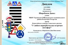 2 а сыйныфы укучысы-Широбоков Данил Бөтенроссия күләмендәге "Юллар чатында безне светофор каршы ала!" дигән рәсемнәр конкурсында катнашып 3нче урын яулады(Җитәкчесе Широбокова Динә Николаевна). Киләчәктә дә уңышлар телибез!