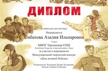 Наши ученица 3б класса Сибатова Азалия участвовала в международном творческом конкурсе "День великой Победы" (руководители Ипоева А.С., Нугманова Д.Х.). Поздравляем с победой и желаем дальнейших творческих успехов.