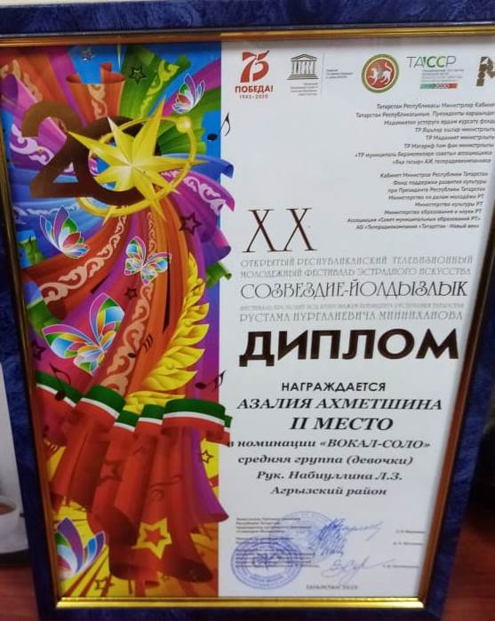 Наша ученица Ахметшина Азалия (руководитель Набиуллина Л.З.) участвовала в зональном этапе открытого республиканского телевизионного молодежного фестиваля эстрадного искусства «Созвездие –Йолдызлык-2020» в с.Муслюмово Муслюмовского района и заняла второе место в номинации "Вокал-соло". Поздравляем ее с победой и желаем дальнейших творческих успехов.