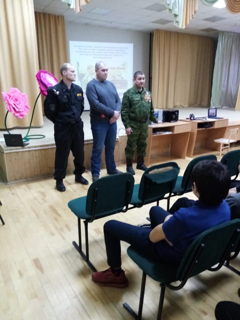 11 декабря в России - день памяти погибших в Чечне. В честь этого сегодня в актовом зале было организовано мероприятие для учащихся 8-11 классов. Оно сопровождалось стихотворениями с глубочайшим смыслом, письмами участников войны, видеоматериалами, наглядно показывающими события войны. Приглашенные гости Канафиев А. М., Тронин И. В., Садыков Р. Р. сообщили о том, что война длилась долго, унесла много невинных жертв, поделились своими пережитыми чувствами, рассказали некоторые подробности. Для юношей они дали советы и призвали защищать Родину. На мероприятии вспомнили Фатыхова Раушана Альбертовича, ученика нашей школы, также принимавшего участие в военных действиях. Погибших в войне почтили минутой молчания.
