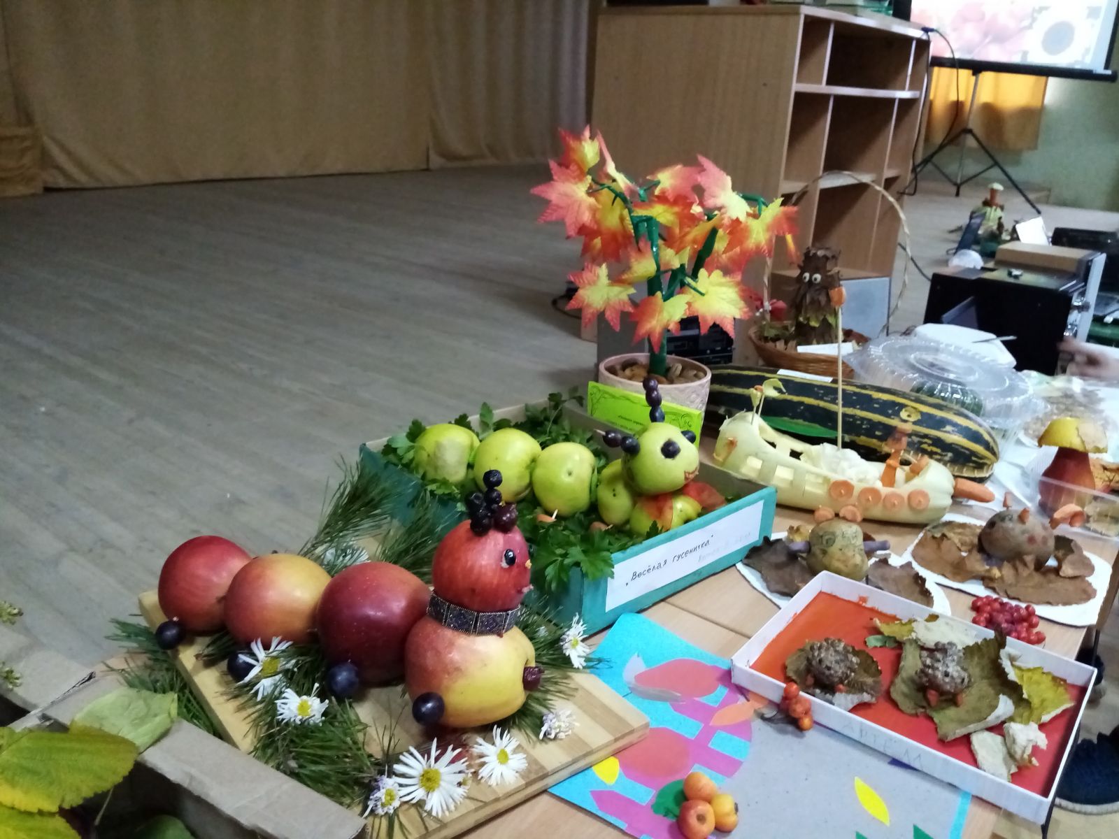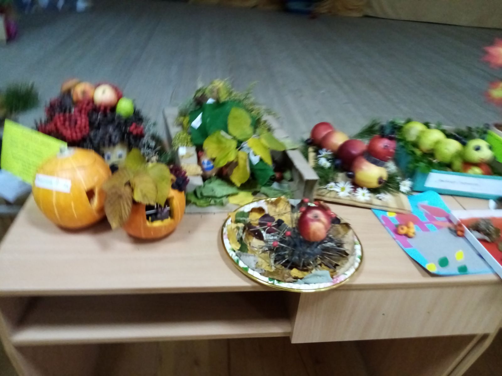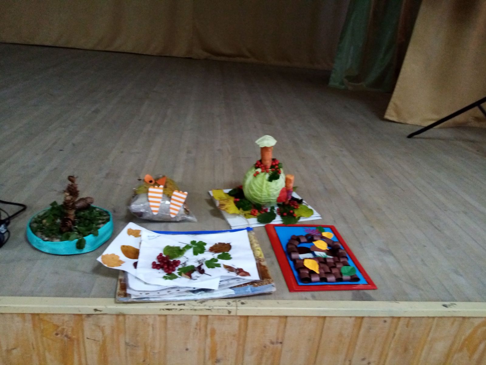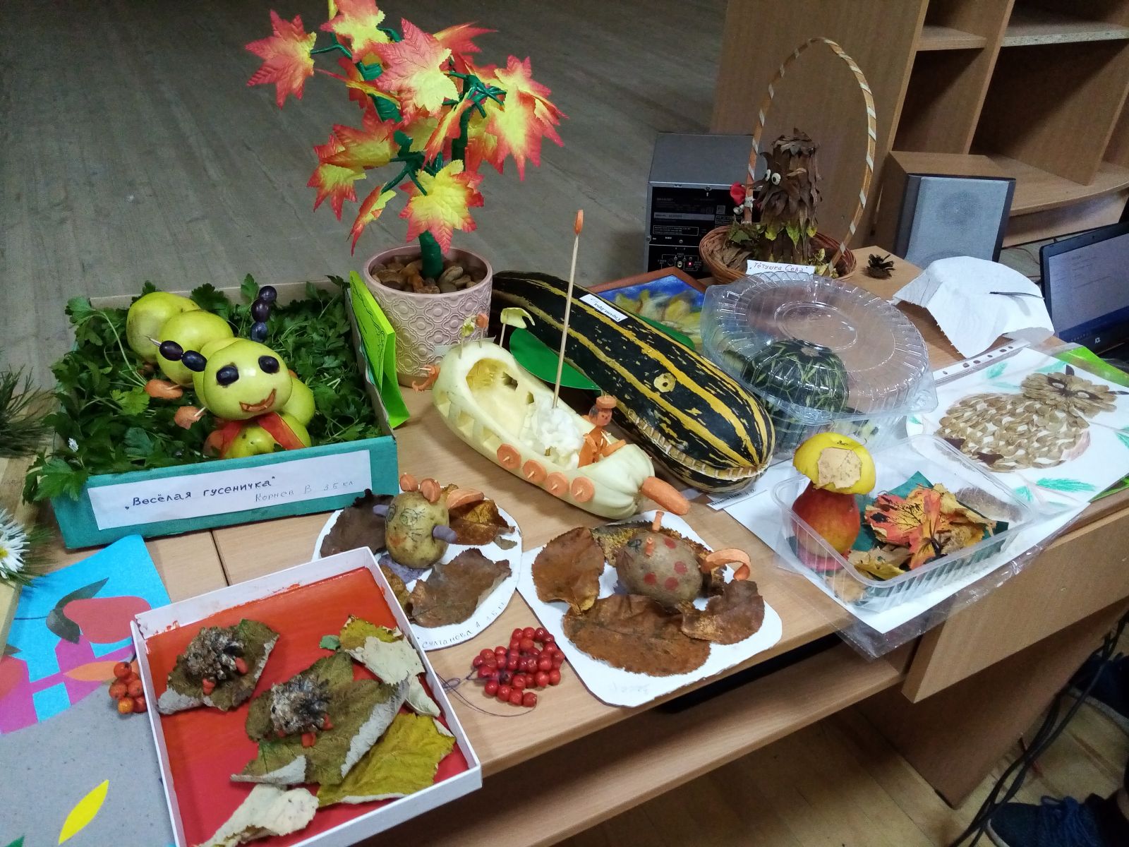 В актовом зале была организована выставка поделок на тему "Дары осени". Учащиеся начальных классов выполнили свои поделки из различных природных материалов. Поразила фантазия детей и умение сделать из самых обыкновенных вещей такие красивые изделия. Выполнение таких поделок способствовало не только развитию творческих способностей и фантазии, но и все больше сплотила детей и родителей в общем совместном деле.
