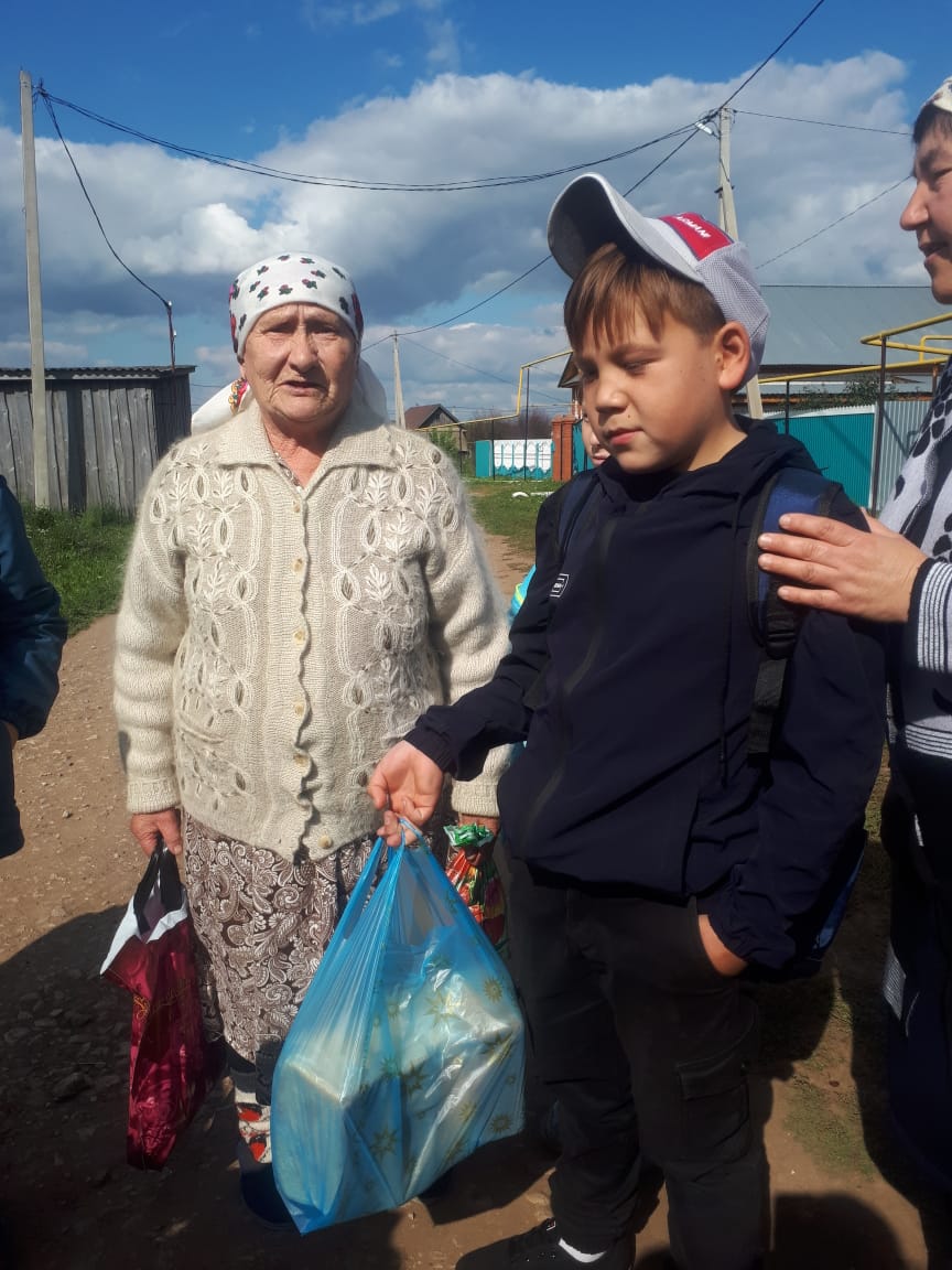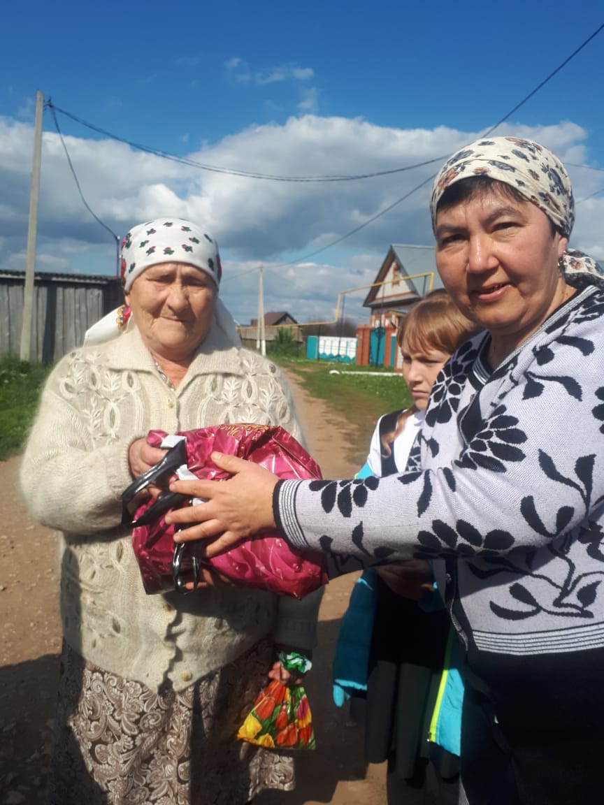 Көннең икенче бурычы - өлкәннәргә ярдәм итү. Шул уңайдан 5 нче А сыйныфы укучылары . Сыйныф җитәкчесе Раушания Ринатовна Низамбиева белән берлектә авылыбызның өлкән кешесе Әлфия апага ярдәм күрсәттеләр. Әлфия апа гомер буе колхозда сыер савучы булып эшләгән, беркайчан да авыр эштән курыкмаган. Ул үзенең тормыш юлы турында кыскача мәгълүмат бирде. Балалар капка төбен һәм ишегалдын чистарттылар. Әлфия апаның күңелен күрделәр.Алдан әзерләп килгән шигырьләрен, җырларын башкардылар. Мәктәп коллективы исеменнән күчтәнәч бирделәр. Очрашудан барысы да канәгать калды.