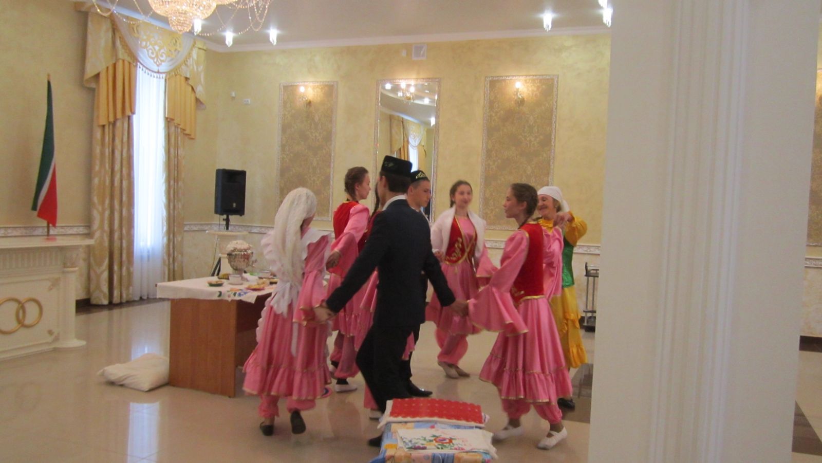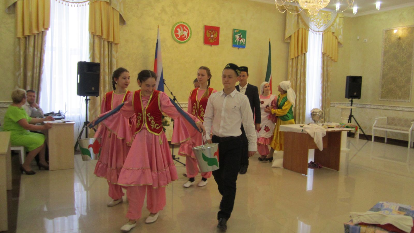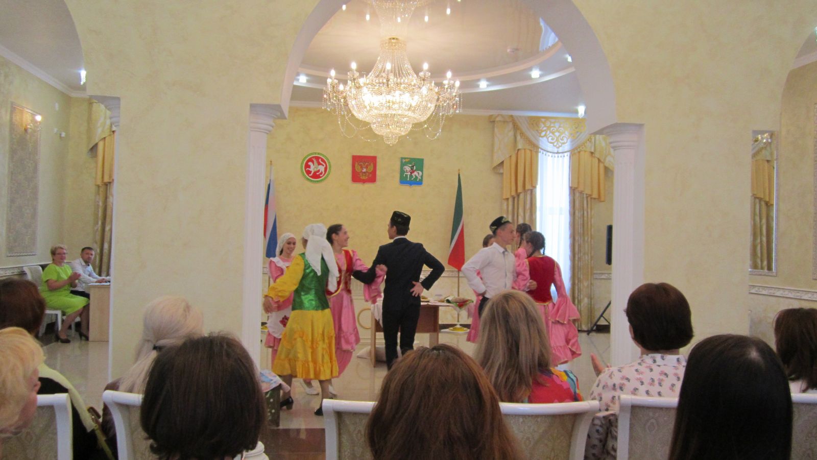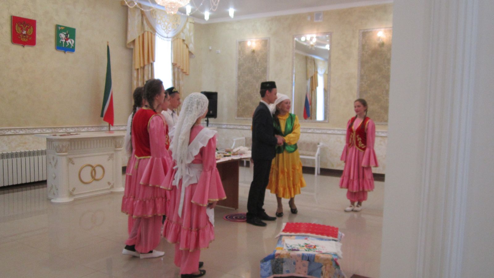В рамках празднования Дня семьи в здании Агрызского ЗАГСА проводился районный семинар учителей по семьеведению и воспитателей детских садов. Группа учащихся нашей школы и учитель татарского языка и литературы Тухватуллина А.А. (под руководством учителя по семьеведению Тукмановой Г.Ф.) выступили с инсценировкой обряда татарской свадьбы. Они артистично показали, как встречают невесту в доме жениха. Цель выступления - показать зрителям свадебные традиции татарского народа.