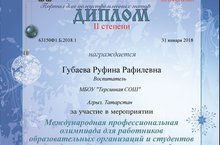 Воспитатель дошкольной группы с.Биктово Губаева Р.Р. награждена дипломом 2 степени за участие в международной профессиональной олимпиаде для работников образовательных организаций "Воспитатель -это звучит гордо!".