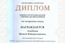 Наша ученица 9 класса Асанбаева Инзиля стала призером республиканской олимпиады по татарскому языку. Поздравляем ее и учителя Сулейманову Г.В. и желаем им дальнейших успехов.