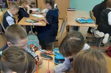 Сегодняшнее занятие маленьких орлят-первоклассников посвящено теме «Спешить на помощь безвозмездно». Начало занятия с построения Орлятского круга входит уже в привычку. Этот круг символизирует руку помощи ребят друг другу, ведь они всегда готовы прийти на помощь, поддержать в трудную минуту. Начинается новый трек «Орленок - доброволец». А кто такой доброволец? Это тот, который спешит на помощь безвозмездно. Таких людей еще зовут волонтерами. Как помогают волонтеры – узнали, посмотрев небольшой видеофильм. В микрогруппах нарисовали портрет добровольца, рассказали какими качествами обладает доброволец. С целью обобщить представления о доброте, побудить детей к совершению добрых поступков, решили открыть коробочку «Добрых дел», где дети будут копить записочки с добрыми делами. В конце трека решили их сосчитать и сделать выводы.