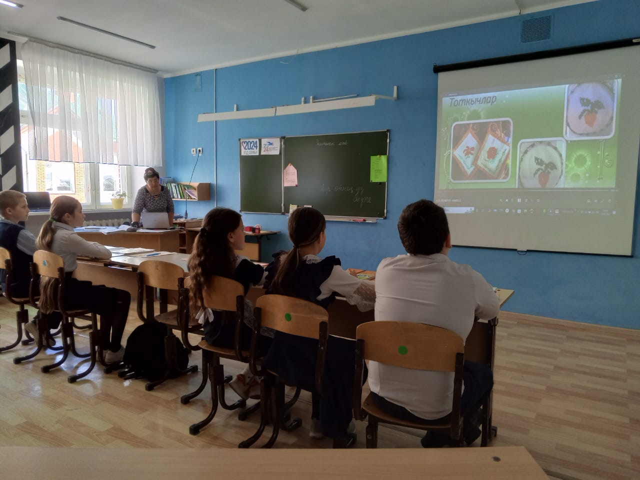 Бүген мәктәптә 5 нче сыйныфта туган тел һәм әдәбияты укытучысы Низамбиева Раушания Ринат кызы татар теленнән ачык дәрес күрсәтте.Дәрес Халкымның милли бизәкләре.Җөмләнең баш кисәкләре темасы буенча үткәрелде.Гаилә елы уңаеннан Вилдан Галләмов әбисе Резеда апа Хуҗаҗан кызының чиккән сөлгеләре, яулык, тоткыч, картиналары турында видеоролик тәкъдим итте.Әбисенең кул эшләнмәләреннән әзерләнгән күргәзмә белән таныштырды. Укучылар төркемнәрдә һәм парларда эшләделәр.Планлаштыру һәм үзбәя битендә эшчәнлекләренә нәтиҗә ясап бардылар.Укытучы дәрестә гади һәм катлаулы кооперация технологиясе, аның кызыклы алымнарын күрсәтте.Төркемдәге укучылар бирелгән бирем буенча чыгыш ясады, бер-берсенә сораулар бирде.Укытучы дәрестә якташ шагыйребез Ч.Мусин шигырьләрен файдаланды. Функциональ грамоталылыкны үстерү максатыннан дәрес ахырында мөстәкыйль эш бирелде.Дәрестә гаилә кыйммәтләре, гаиләдәге якын кешеләргә хөрмәт, туган җиреңне һәм туган нигезеңне ярату хисе тәрбияләнде.