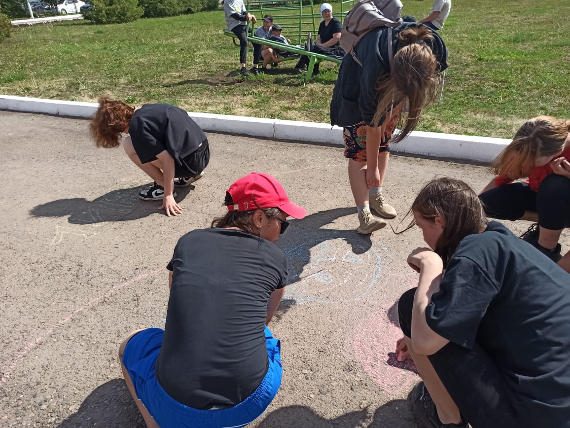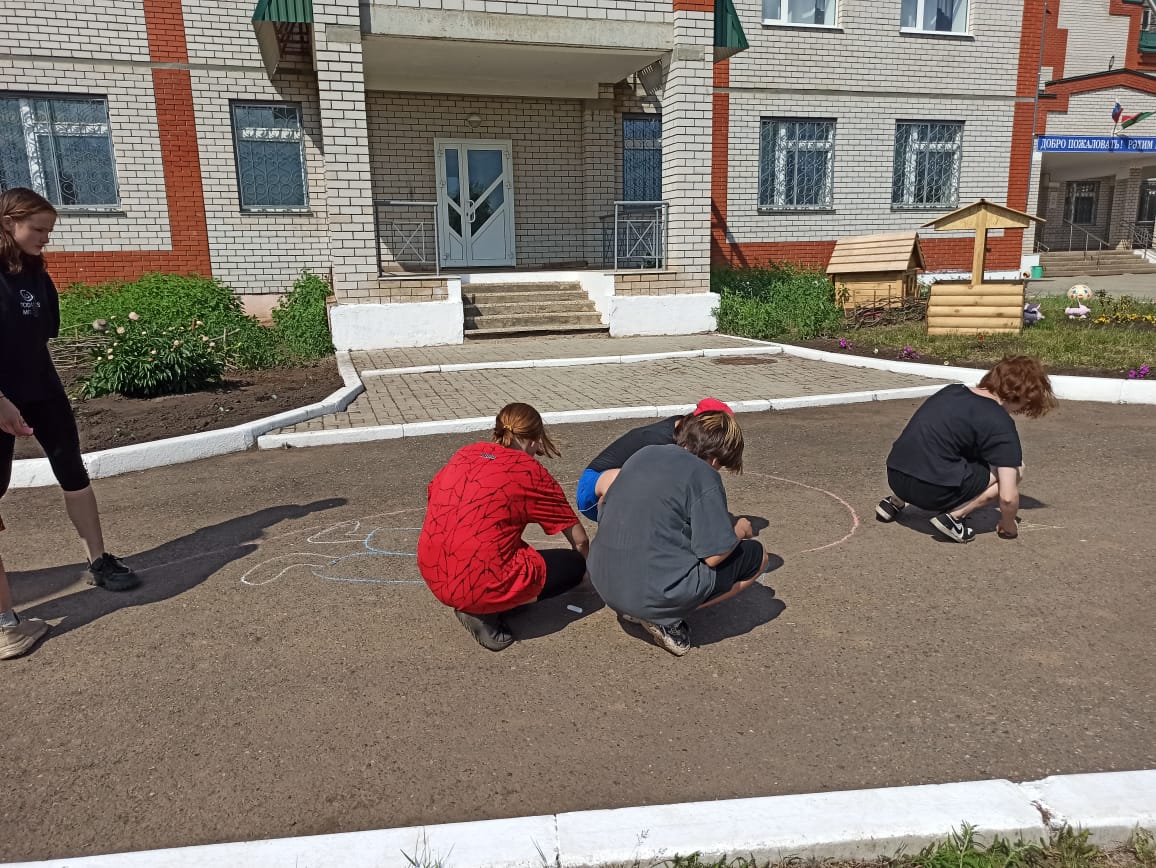 На базе нашей школы открылся лагерь труда и отдыха "Апельсин".Этот первый день долгожданных летних каникул является Днём защиты детей, именно об этом была проведена беседа с подростками.На асфальте рисунки - внутри большого сердца ребенок, что означает, что дети- это самое дорогое у родителей и общества.Активный отдых ребят развивает их физические силы,самостоятельность и ответственность,индивидуальные творческие способности.Самое главное- труд и отдых на свежем воздухе способствует укреплению здоровья.