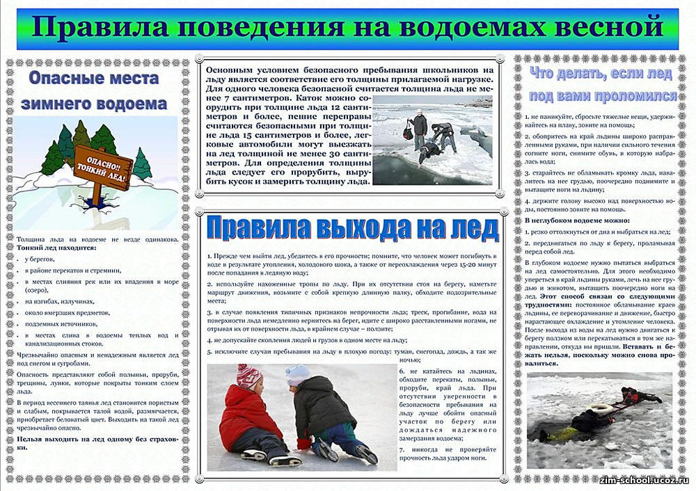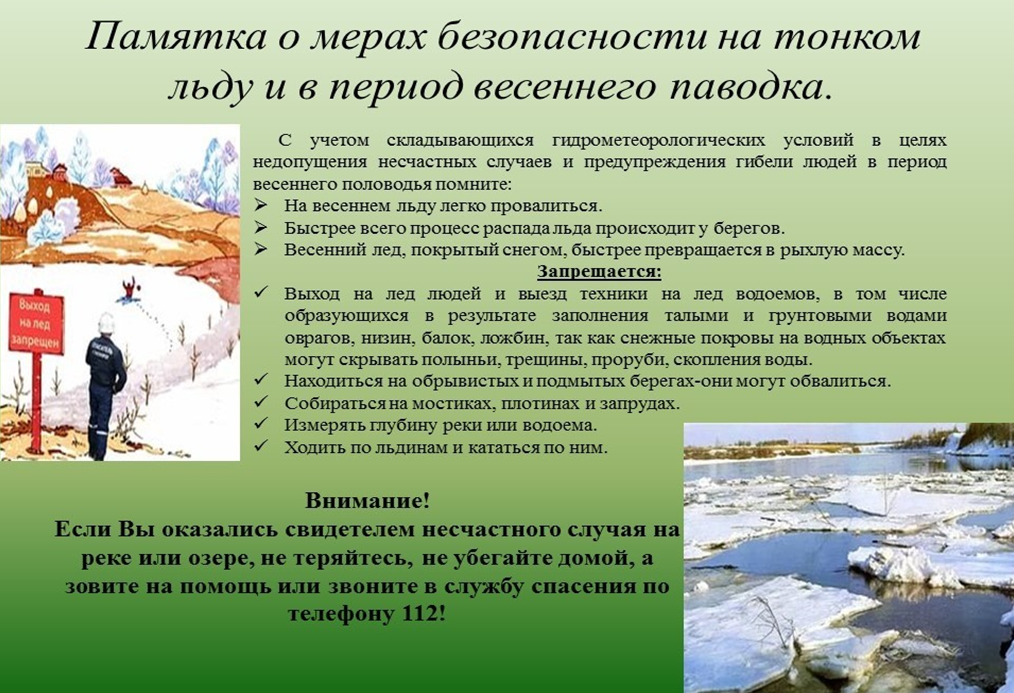 Сейчас необходимо помнить, что весенний лед очень коварен, солнце и туман задолго до вскрытия водоемов делают его пористым, рыхлым, хотя внешне он выглядит крепким. Такой лед не способен выдержать вес человека, не говоря уже о транспортных средствах. Период половодья требует от нас порядка, осторожности и соблюдения правил безопасности поведения на льду и воде.