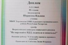 4 б сыйныф укучысы Шаракина Ильpина "Юл йөрү кагыйдәләрен бозмагыз, машина йөртүчеләр һәм җәяүлеләр!" Рәсемнәр конкурсында диплом белән бүләкләнде.