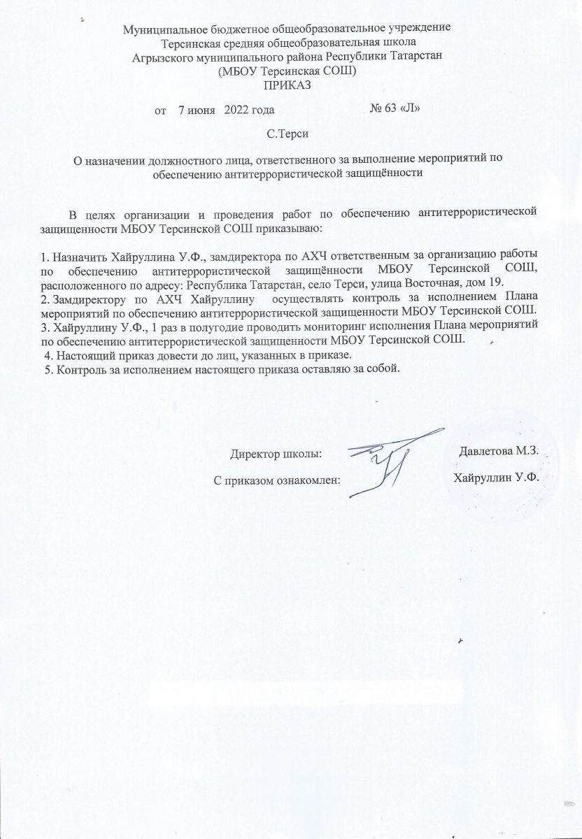Приказ о назначении должностного лица ответственного за выполнение мероприятий по обеспечению антитеррористической защищённости.