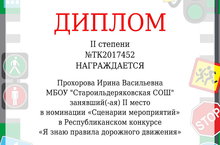 Поздравляем Прохорову Ирину Васильевну, заместителя директора по воспитательной работе Староильдеряковской школы, занявшей 2 место в номинации "Сценарий мероприятия" Республиканского конкурса "Я знаю правила дорожного движения"
