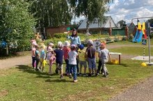 В целях ознакомления с татарским народным праздником; создания праздничной доброжелательной атмосферы, с детьми провели веселый сабантуй. Дети соревновались в играх: перетягивание каната, бег с ложками, ведрами с коромыслом, бег в мешках и других. Было весело и увлекательно танцевать всем вместе под задорную татарскую мелодию.
