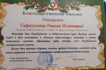 Заведующая нашего детского сада Сафиуллина Р.И. получила благодарственное письмо от главы Аксубаевского муниципального района Гилманова К.К.