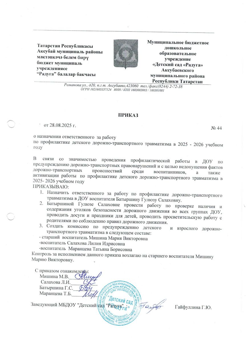♦Приказ о назначении ответственного за работу по профилактике ДДТТ на 2025-2026 уч год