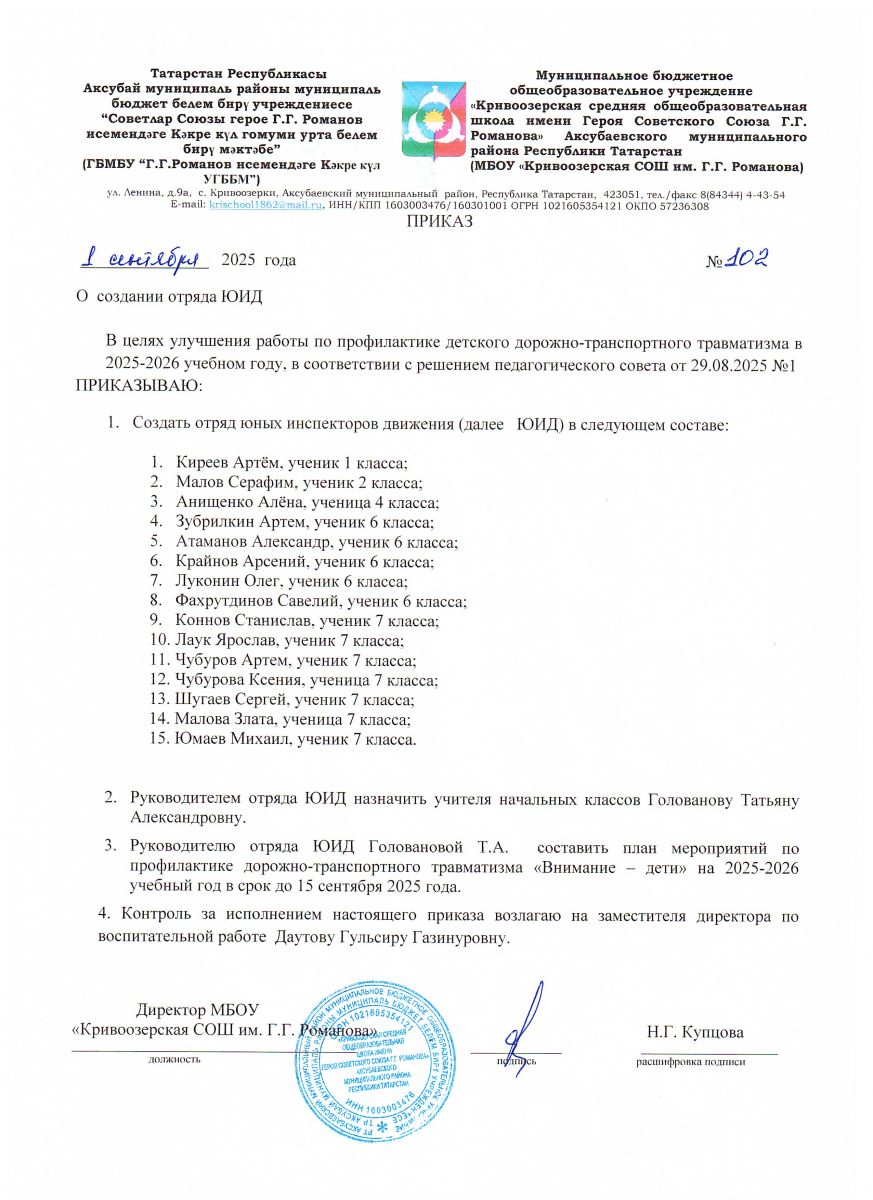 Приказ о закреплении руководителя отряда ЮИД и создании отряда ЮИД на 2025-2026 учебный год