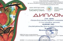 Туган телләр Һәм халыклар бердәмлеге елына багышланган "Мин яратам сине, Татарстан!" ачык республикакүләм бәйгесендә "Халкым белән мин горурмын" номинациясендә 3 сыйныф укучысы Сәит Фәизов 1 дәрәҗә Диплом белән бүләкләнде (җитәкчесе Кабирова И.М.). Котлыйбыз!