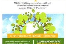 Министерство экологии и природных ресурсов Республики Татарстан присвоило нашей школе звание "Экогероя" за активное участие в акции "Сдай макулатуру-спаси дерево"