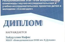 Ученик 7 класса Зайдуллин Нафис стал призером республиканского этапа Всероссийской олимпиады учебных и научно-исследовательских проектов детей и молодежи «Созвездие-2018» в номинации «Энергия и человек». Молодец, поздравляем!
