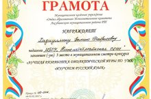 Педагог МБОУ "Нижнетатмайнская СОШ" Хадиуллина Фания Табрисовна в муниципальном смотре-конкурсе "Лучшая разработка дидактической игры по УМК "Изучаем русский язык" заняла 3 место.