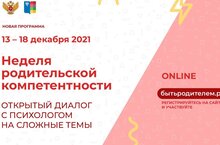 С 13 по 18 декабря 20212 года пройдет Неделя родительской компетентности – открытый диалог с психологом на сложные темы. Мероприятие будет проходит в онлайн-формате. Организаторы Недели: Министерство просвещения РФ, Московский государственный психолого-педагогический университет. Регистрацию можно пройти на сайте Бытьродителем.рф.