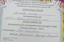 Поздравляем воспитанницу Леонтьеву Злату, участника муниципального этапа конкурса "Умный совёнок" и руководителя Ярославлеву Н.Н. Желаем удачи в начинаниях!