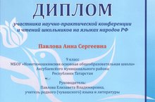 Дипломом участника была отмечена работа ученицы 9 класса Павловой А. за участие в республиканской НПК и чтении школьников на языках народов РФ. Под руководством учителя родного (чувашского) языка Павловой Е.В. она подготовила иследовательскую работу о творчестве В.Л.Левукова, писателя-земляка. Данная работа напечатана в сборнике участников конференции.