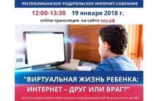 19.01.2018 с 12.00 до 13.30 состоится Республиканское родительское интернет-собрание «Виртуальная жизнь ребенка: интернет – друг или враг?». Он-лайн трансляция собрания будет вестись на сайте Казанского инновационного университета имени В.Г.Тимирясова по адресу: https://ieml.ru/.