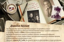 Акция "Семейные фотохроники" 04.02.2018 Дорогие ученики , родители! Не оставайтесь равнодушными и внесите свой вклад в сохранение народной памяти о Великой войне. Приглашаем Вас принять участие в акции "Семейные фотохроники". Для этого просим принести фотографии военных лет в школу. Здесь при вас же мы отсканируем её и возвращаем Вам. Будем очень Вам благодарны.