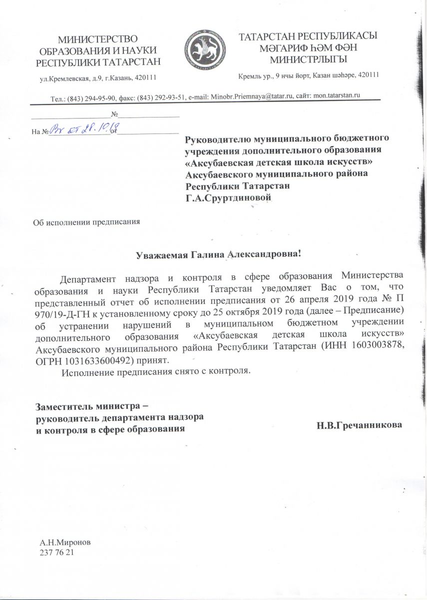 Письмо об исполнении предписания. Департамент надзора и контроля с сфере образования МО и Н РТ.