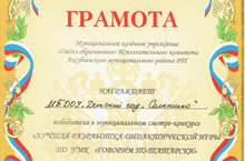 Грамота победителя в муниципальном смотре-конкурсе "Лучшая разработка дидактической игры по УМК "Говорим по-татарски" 06.04.2016