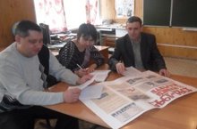 Учителя Сулейманов Р.Х., Сафиуллин Я.Г., Залалтдинова Ф.М. на заседании ШМО учителей истории, географии, биологии решили вопросы выпуска стендгазет на тему :"70 - летие Великой Победы".