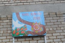 Мәктәп бинасының диварына Бөек Җиңүнең 70-еллыгына багышланган баннер куелды.