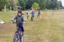 Члены кружка ЮИД на велосипедах проходят полосу препятствий.