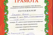 07.02.2013 году проводилась научно-практическая конференция "Интеллект, здоровье, нравственность", где участвовал Ефимов Антон по теме: "Сохранение биологического разнообразия экосистем" и занял третье место. Руководитель Зольникова Е.В. Поздравляем. Молодцы