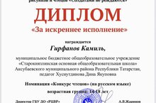 Ученик 9 класса Гирфанов Камиль награждается дипломом Vlll Республиканского творческого конкурса рисунков и чтецов «Солдатами не рождаются»