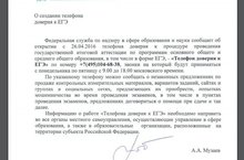 «Телефон доверия к ЕГЭ» +7(495)104-68-38, звонки на который будут приниматься с понедельника по пятницу с 9.00 до 18.00 московского времени. По указанному телефону можно сообщать о незаконных предложениях по продаже контрольных измерительных материалов, вариантов заданий и сайтах и группах в социальных сетях, предлагающих их приобрести, попытках мошенничества во время проведения экзаменов, предложениях договориться о помощи при сдаче и т.д.