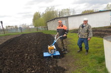 Мотоблок в работе. Раиль Галиаскарович и Леонид Юриевич пашут пришкольно-опытный участок. Первая борозда