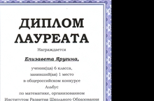 Известны результаты общероссийских предметных олимпиад. Английский язык -Молоткина Екатерина (4кл) и Проглядо Яна (4кл) - 5 место в общероссийской олимпиаде (учитель Киямова Лилия Ринатовна); математика - Елауркин Николай (6кл)-3место, Яругина Елизавета (6кл) -1 место , ( учитель Зайцева Галина Геннадиевна), Елауркин Петр (4кл) -7место (учитель Симакаева Ирина Ивановна); русский язык -Симакаев Алексей (6кл)-10место (учитель Самаренкина Татьяна Николаевна), Фролова Элина (4кл) - 3место (учитель Симакаева Ирина Ивановна). Ребята награждены Дипломом Лауреата , а 1 и 3 место в подарок -книга.