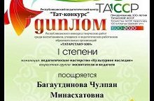 Учитель родного языка и литературы Багаутдинова Чулпан Минасхатовна учавствовала в Республиканском конкурсе творческих работ среди воспитанников, учащихся и педагогических работников образовательных организаций "Татарстану-100!" и награждена дипломом 1 степени в номинации педагогическое мастерство "Культурное наследие".